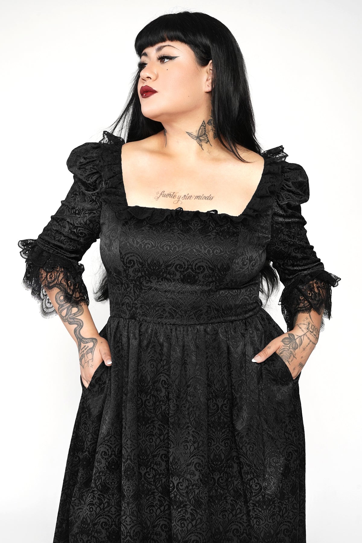 The Agatha ensures that you are dressed for the occasion, whether that be high tea in the courtyard or a moonlight stroll with your sweetheart. The Agatha emits an air of gothic mystère with a square neckline that beckons a second look. Inspired by elements of late 18th century French designs and Victorian Mourning fashion, the Agatha channels historical beauty into a wearable, practical, and eye-catching must-have.
