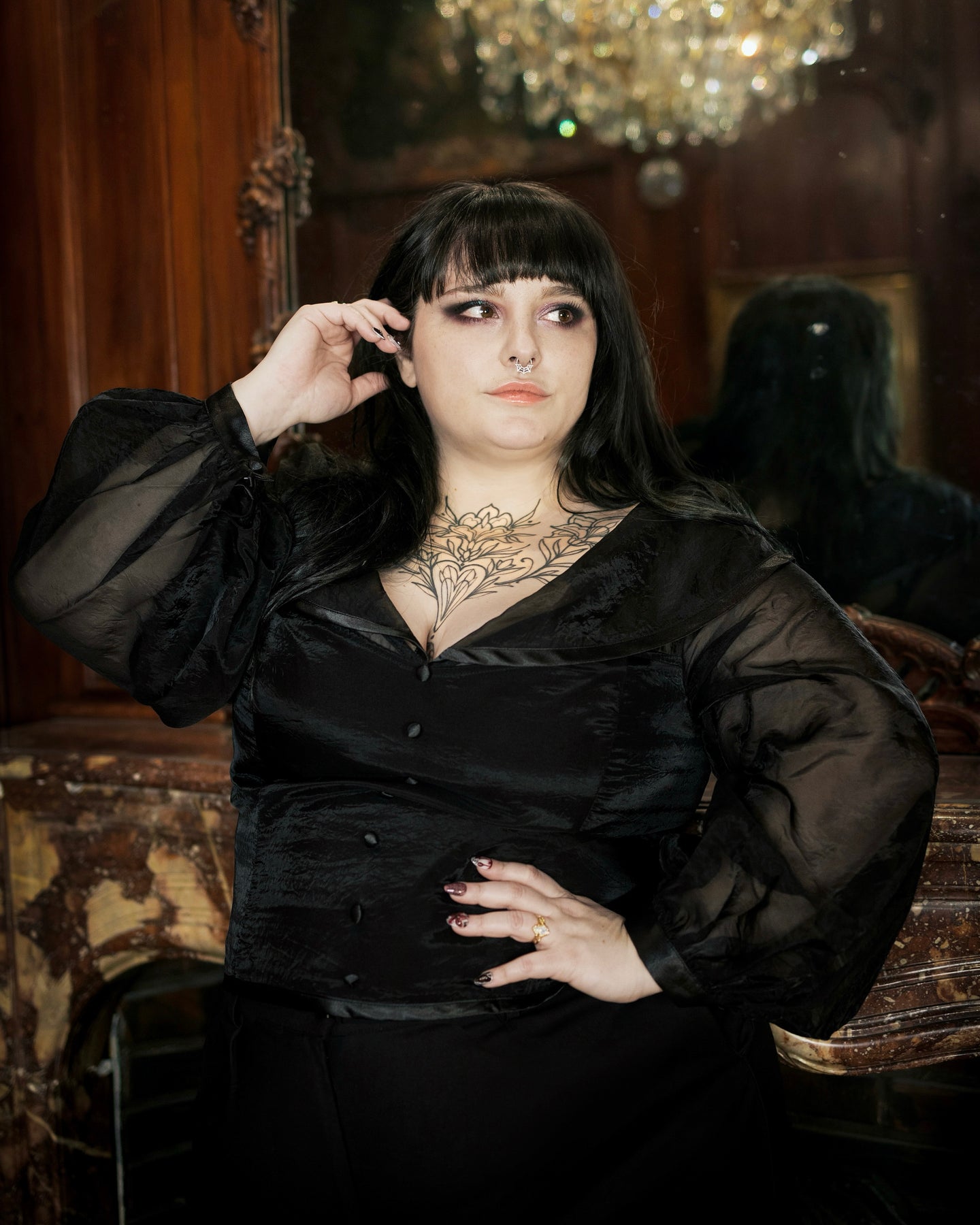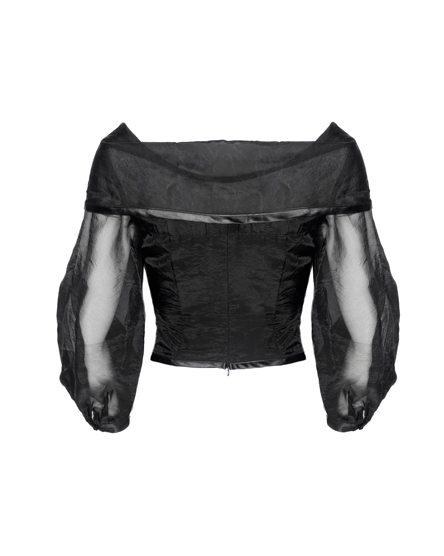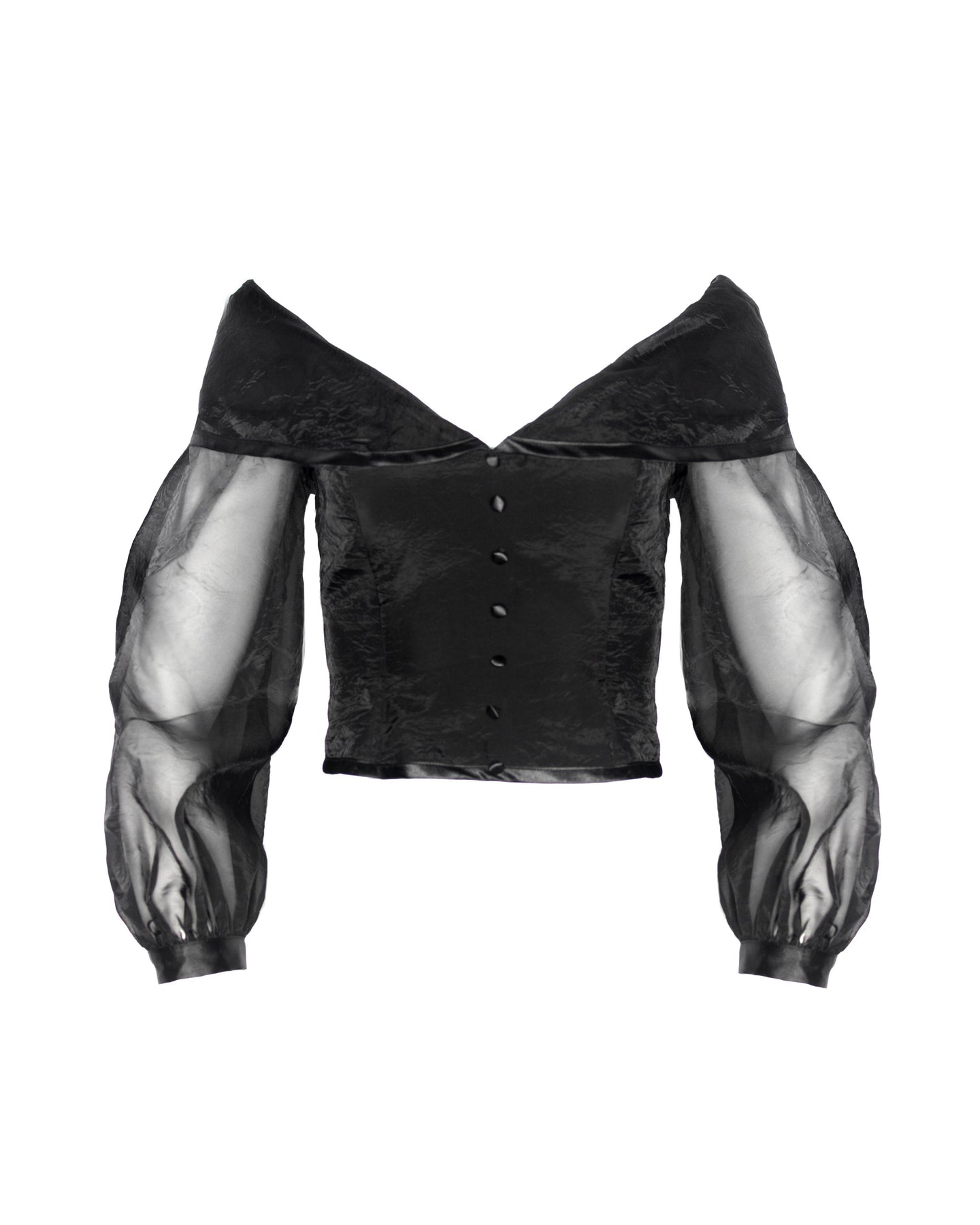 She named the blouse in homage to Maria Félix, the legendary Mexican actress celebrated for her commanding presence and iconic style. The blouse features a softly structured base layered with sheer organza, creating depth and a distinctly vintage feel, with billowing organza sleeves that can be worn on or off the shoulder. Shiny satin ribbon trims add subtle contrast, while fabric-covered buttons run down the front and at the cuffs for a fully functional, considered finish.